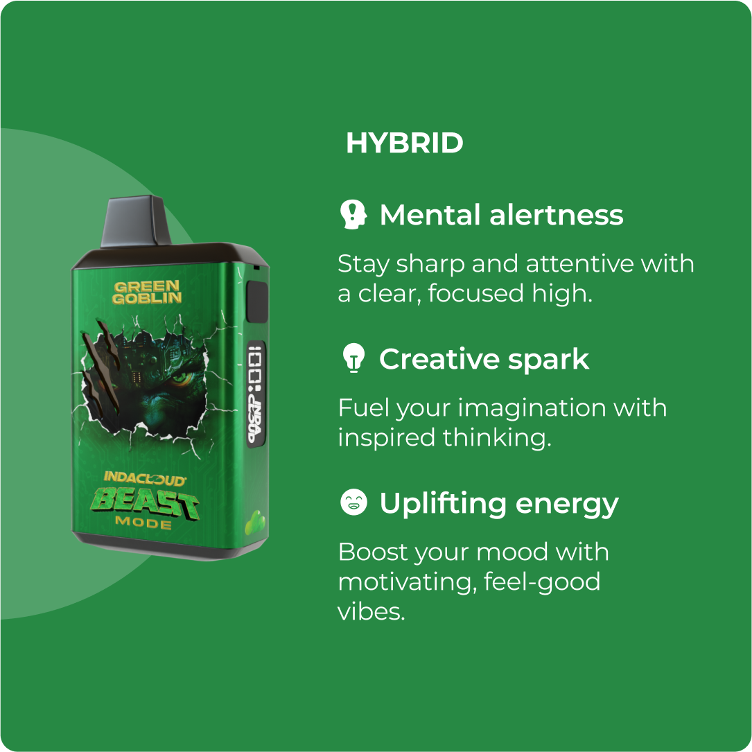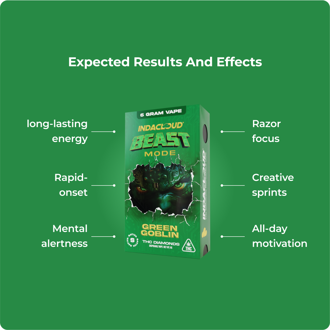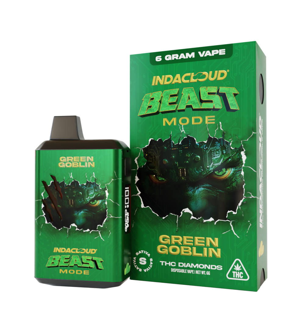 Massive 6g disposable loaded with THCA diamonds, Green Goblin delivers sustained sativa energy, crisp clarity, and refreshing pine-lime flavor in Beast Mode strength.